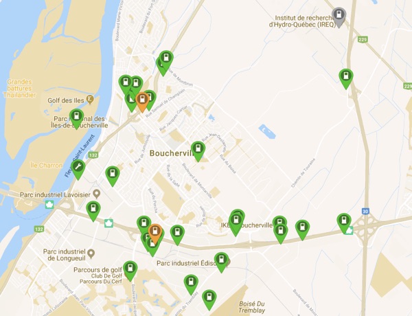 Une trentaine d’endroits à Boucherville ont des bornes publiques. Les bornes rapides sont en brun.